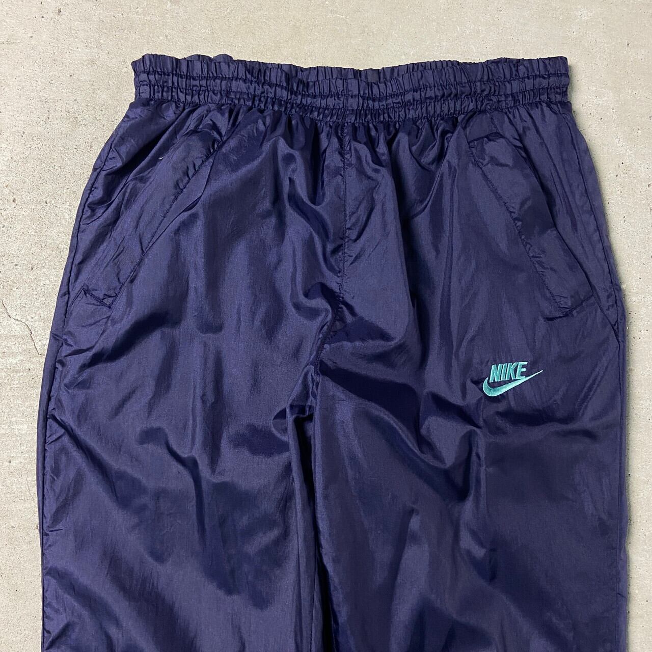 90年代 NIKE ナイキ ナイロンパンツ ウォームアップパンツ 銀タグ メンズS 古着 90s ヴィンテージ VINTAGE ジョグパンツ ウエスト紐入り 裾ジップ 紫色【ロングパンツ】/パープル【BS25-50】