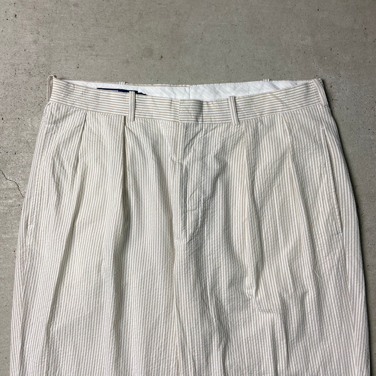 90年代 Polo by Ralph Lauren ポロバイラルフローレン シアサッカーパンツ 2タック ピンストライプ ポロチノ メンズW35 古着 90s ヴィンテージ VINTAGE ワイドチノパンツ ホワイト ベージュ ライトブラウン 白 茶色【チノパンツ,コットンパンツ】/ホワイト