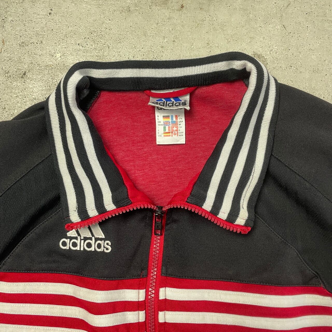 ■90年代 adidas アディダス トラックジャケット ジャージ メンズS相当 レディース 古着 90s パフォーマンスロゴ ヴィンテージ VINTAGE 切り替えデザイン ハイネック サイドライン 赤色 黒色 ブラック【ジャージ・トラックジャケット】/レッド