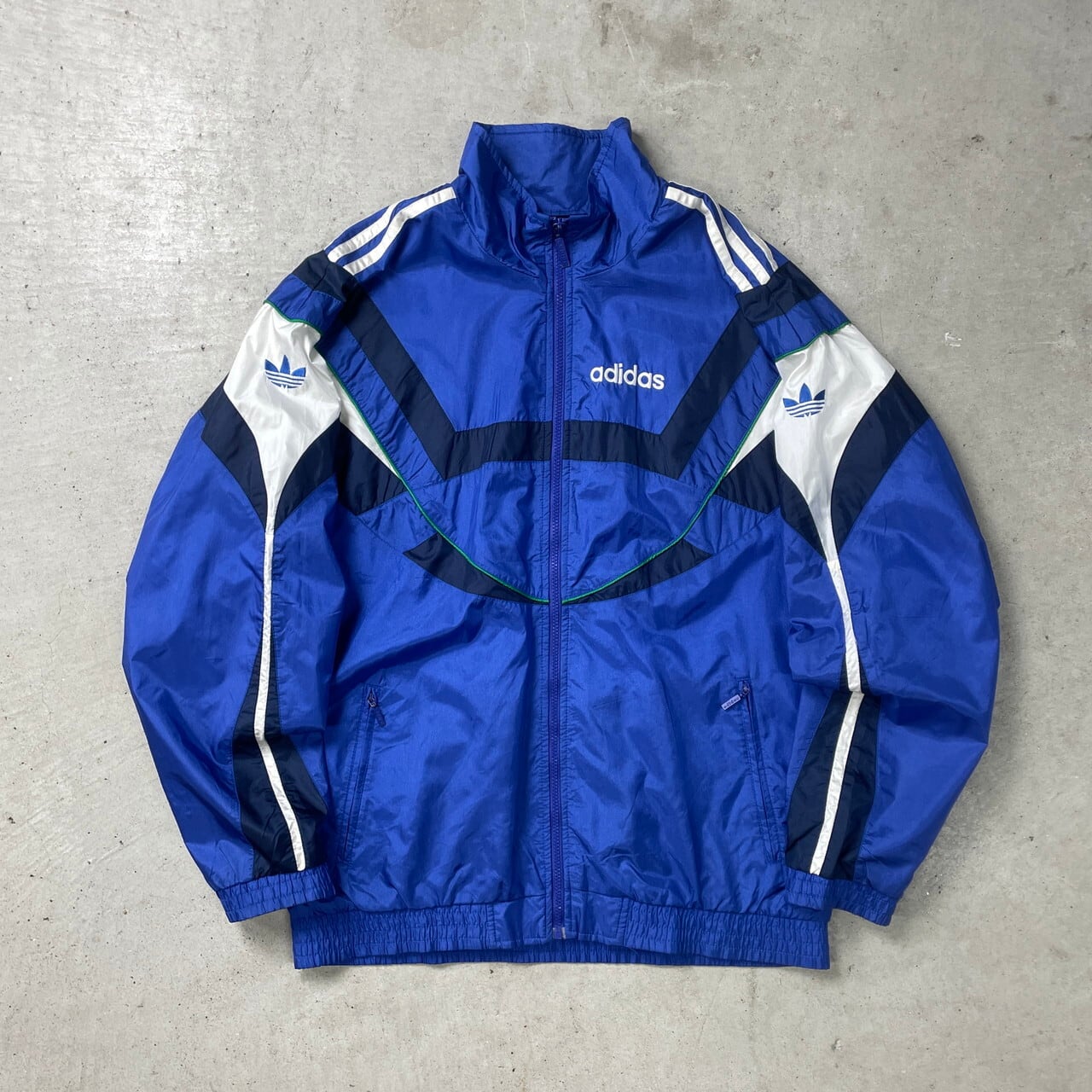 90年代 adidas アディダス ナイロンジャケット トラックジャケット トレフォイルロゴ刺繍 メンズL 古着 90s ヴィンテージ VINTAGE 切替デザイン ブルー 青 ブラック 黒 ホワイト 白 グリーン 緑【ナイロンジャケット】/ブルー