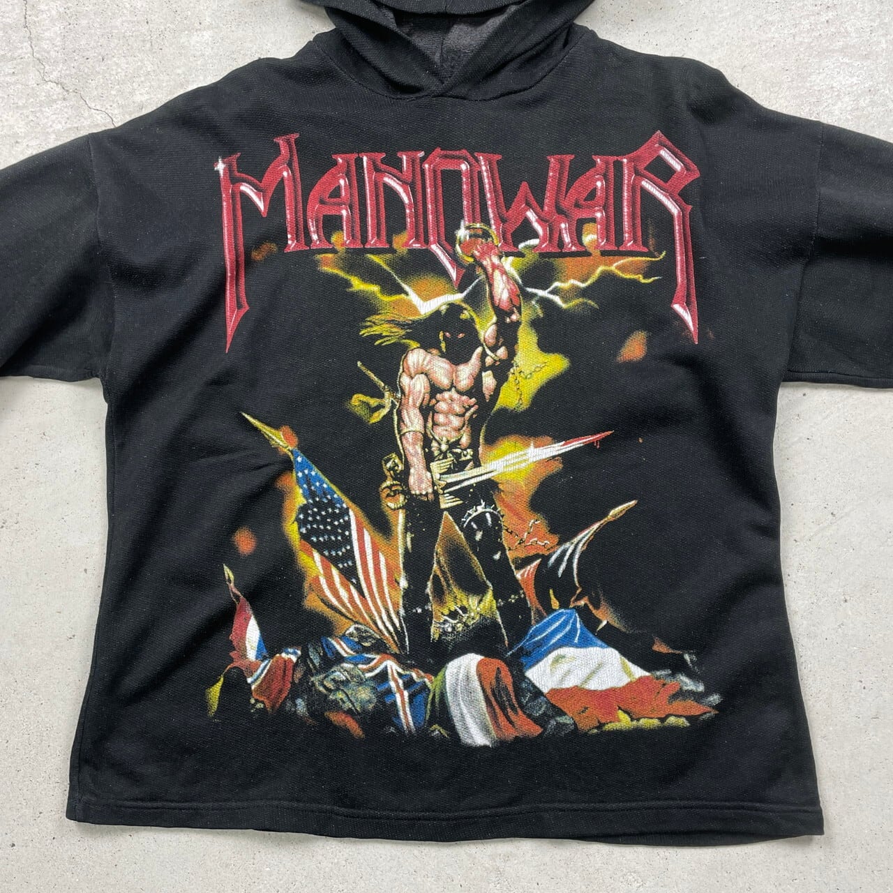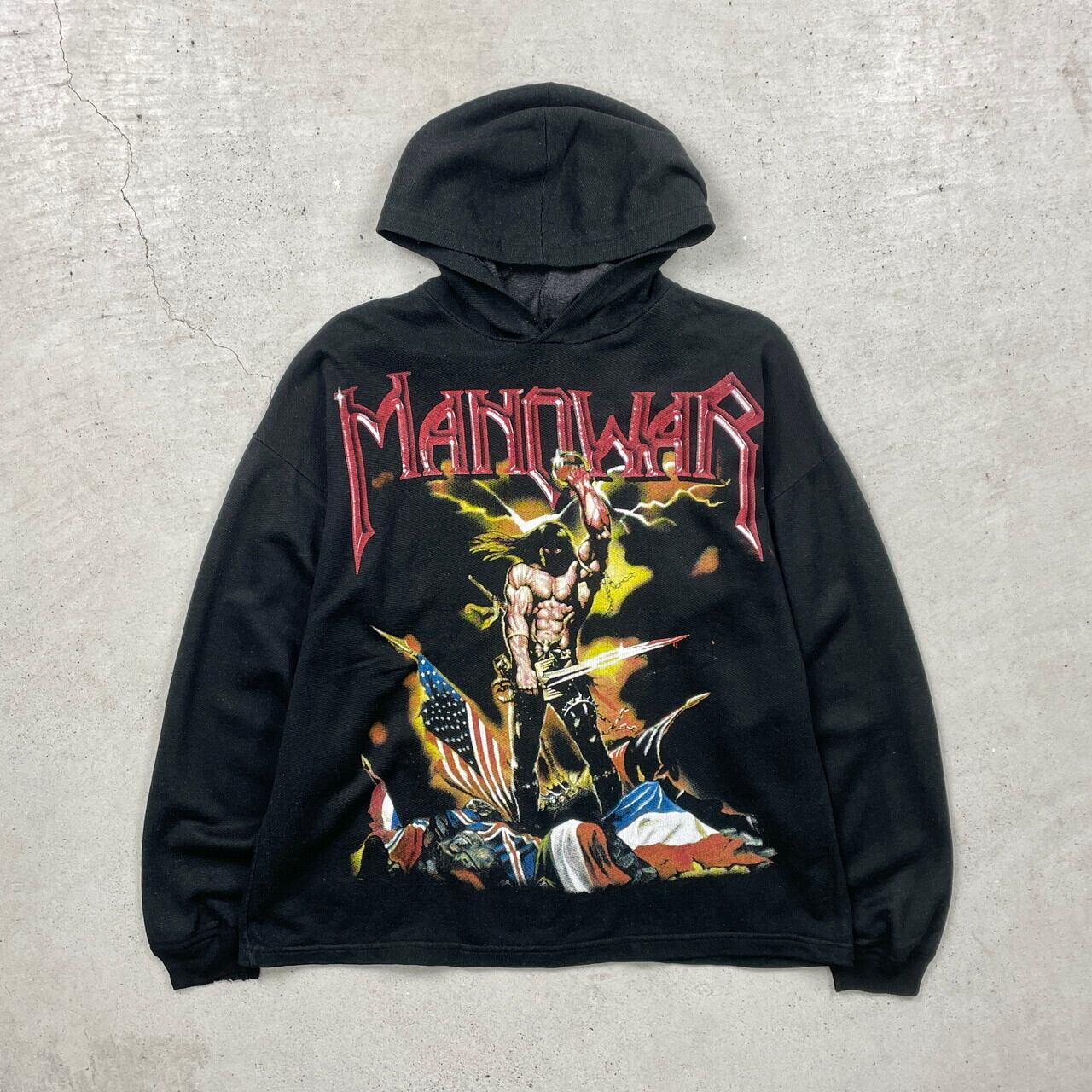 ■MANOWAR マノウォー ヘビメタ バンドスウェットパーカー 薄手 メンズL相当 古着 トレーナー 黒色【パーカー】/ブラック