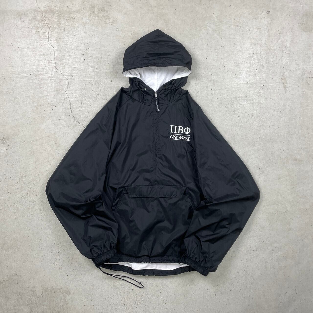 CHARLES RIVER APPAREL ナイロンアノラックパーカー メンズL相当 レディースXL相当 古着 デザイン刺繍 ドローコード ラグランスリーブ VINTAGE ヴィンテージ 黒 ホワイト【ナイロンジャケット】/ブラック