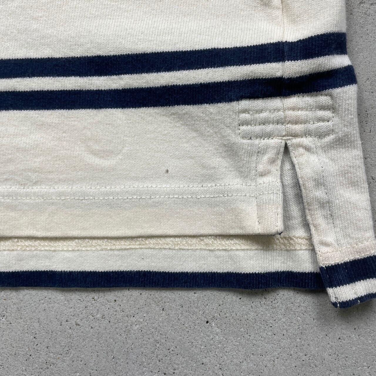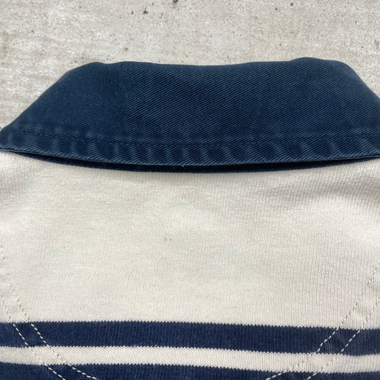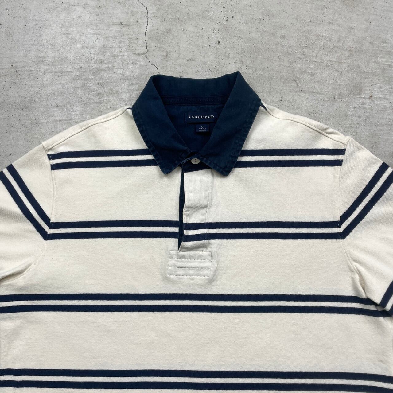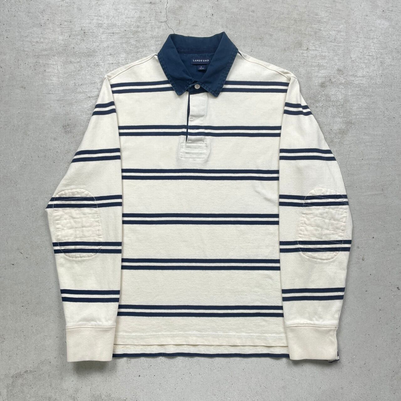 ■LANDS' END ランズエンド ボーダー ラガーシャツ メンズXL相当 古着 アメカジ エルボーパッチ VINTAGE ヴィンテージ 紺 白 ネイビー【ポロシャツ・ラガーシャツ】/ホワイト