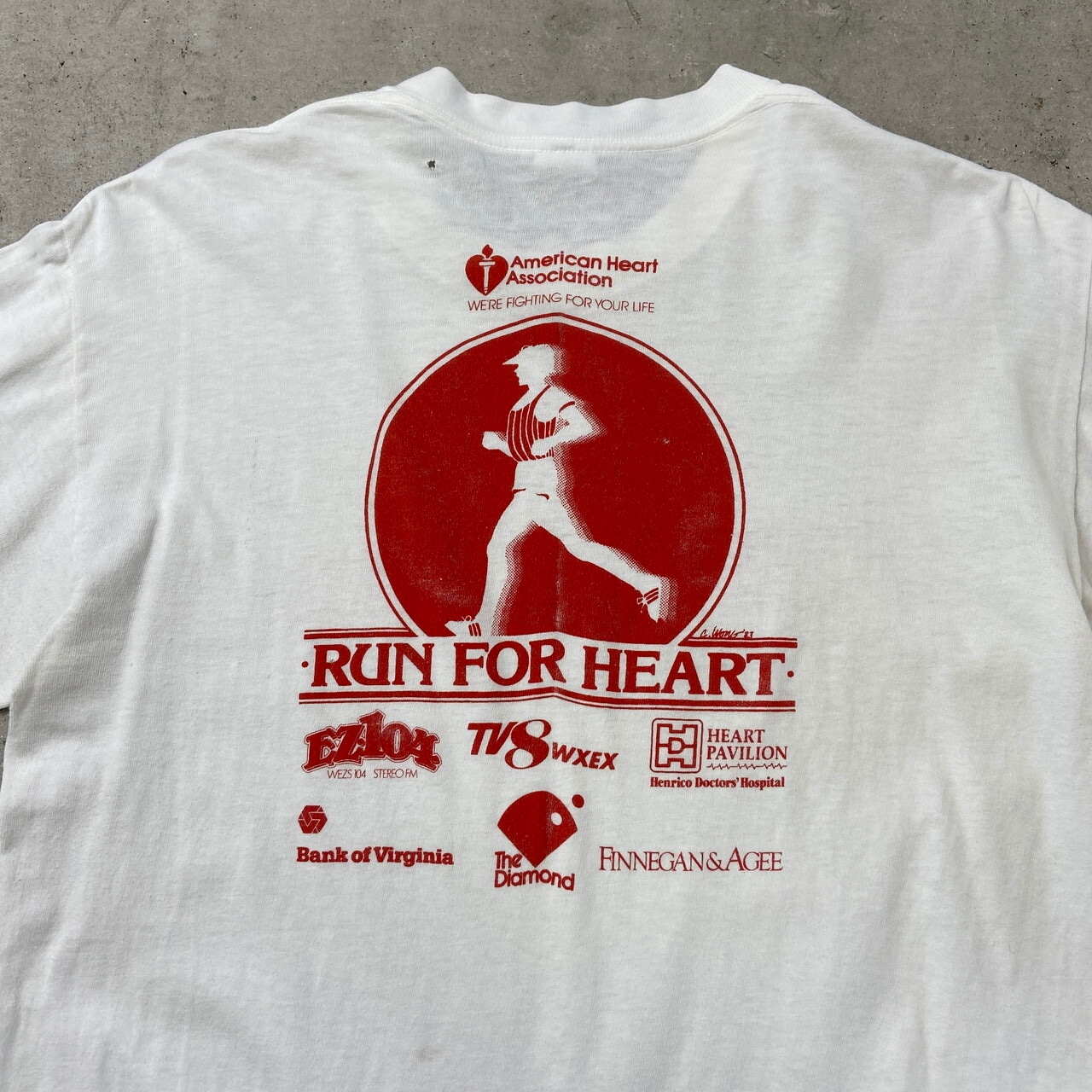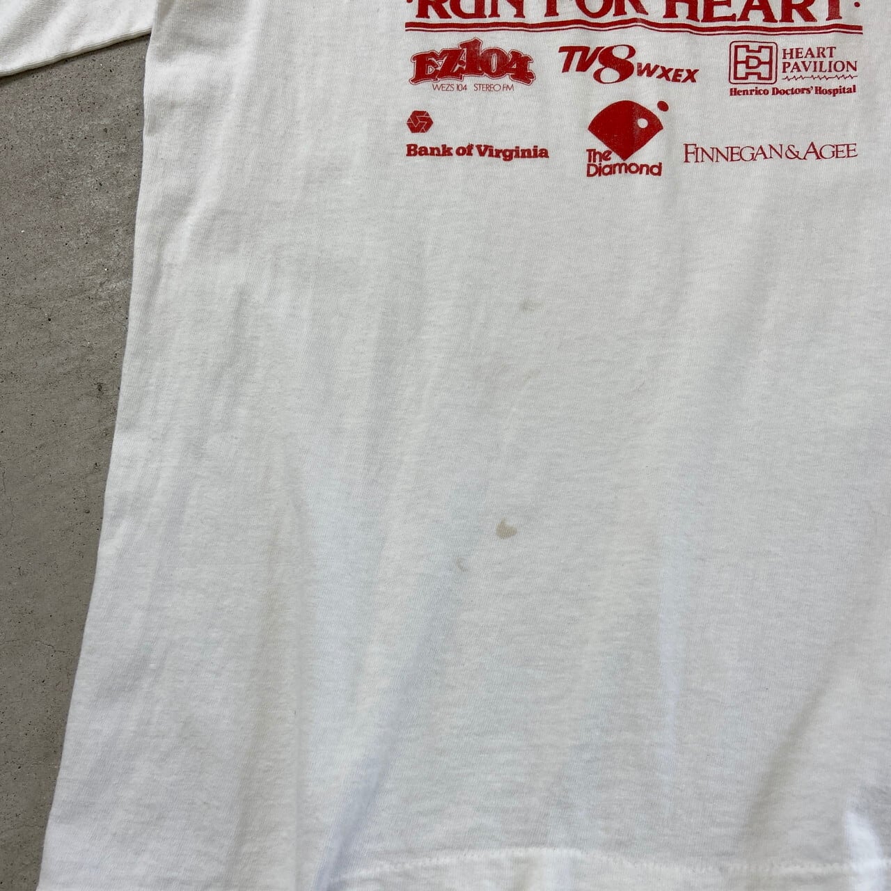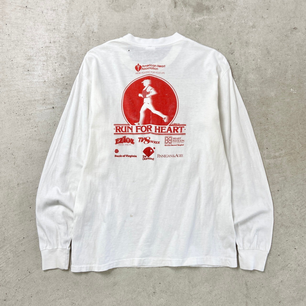 ■80年代 USA製 RUN FOR HEART プリント ロングTシャツ メンズM相当 古着 80s 1986 ヴィンテージ VINTAGE バックプリント 胸ロゴ イベント 企業ロゴ ロンT シングルステッチ 白【ロングTシャツ】/ホワイト