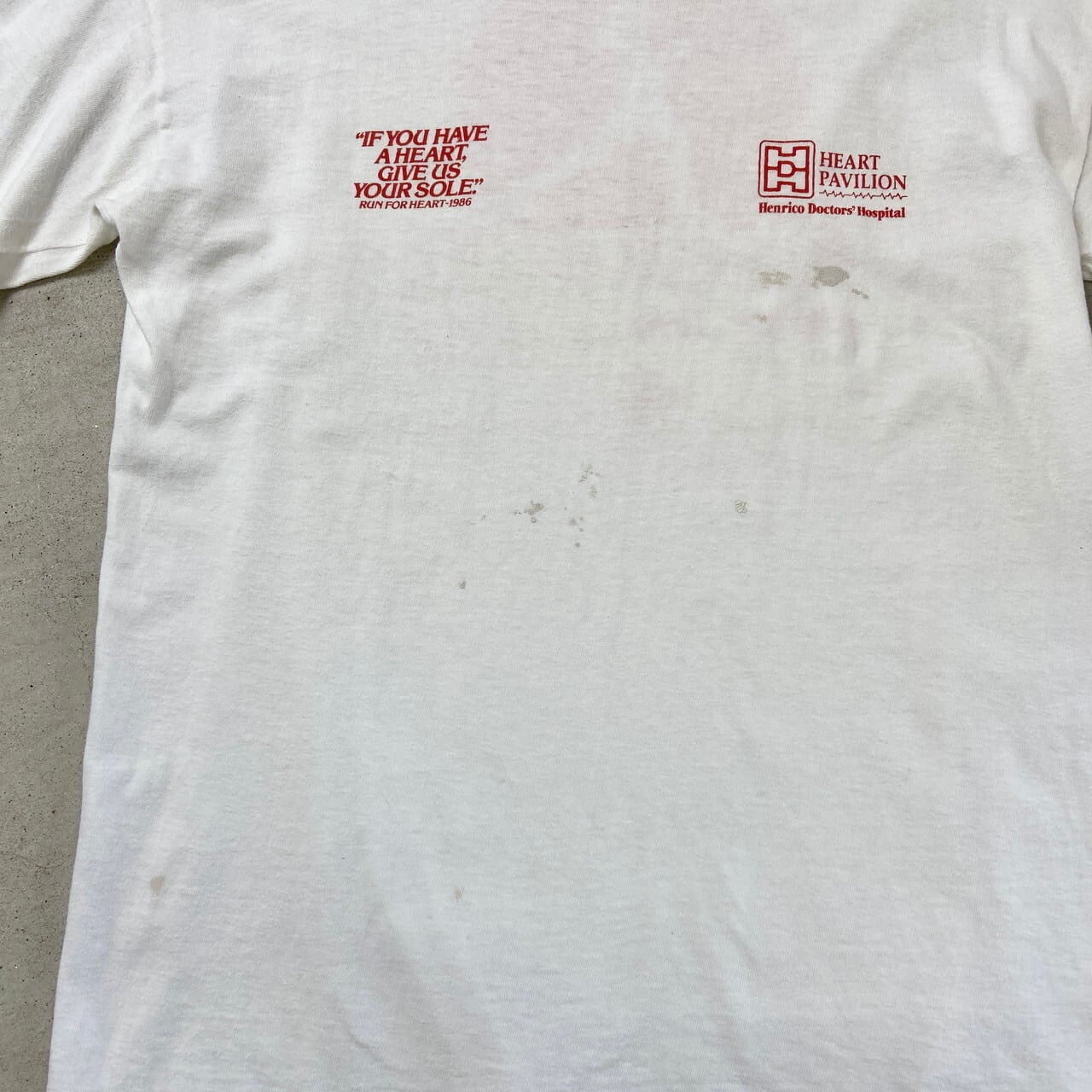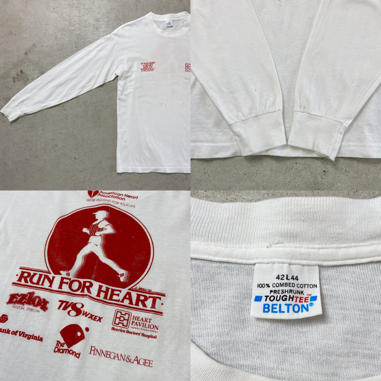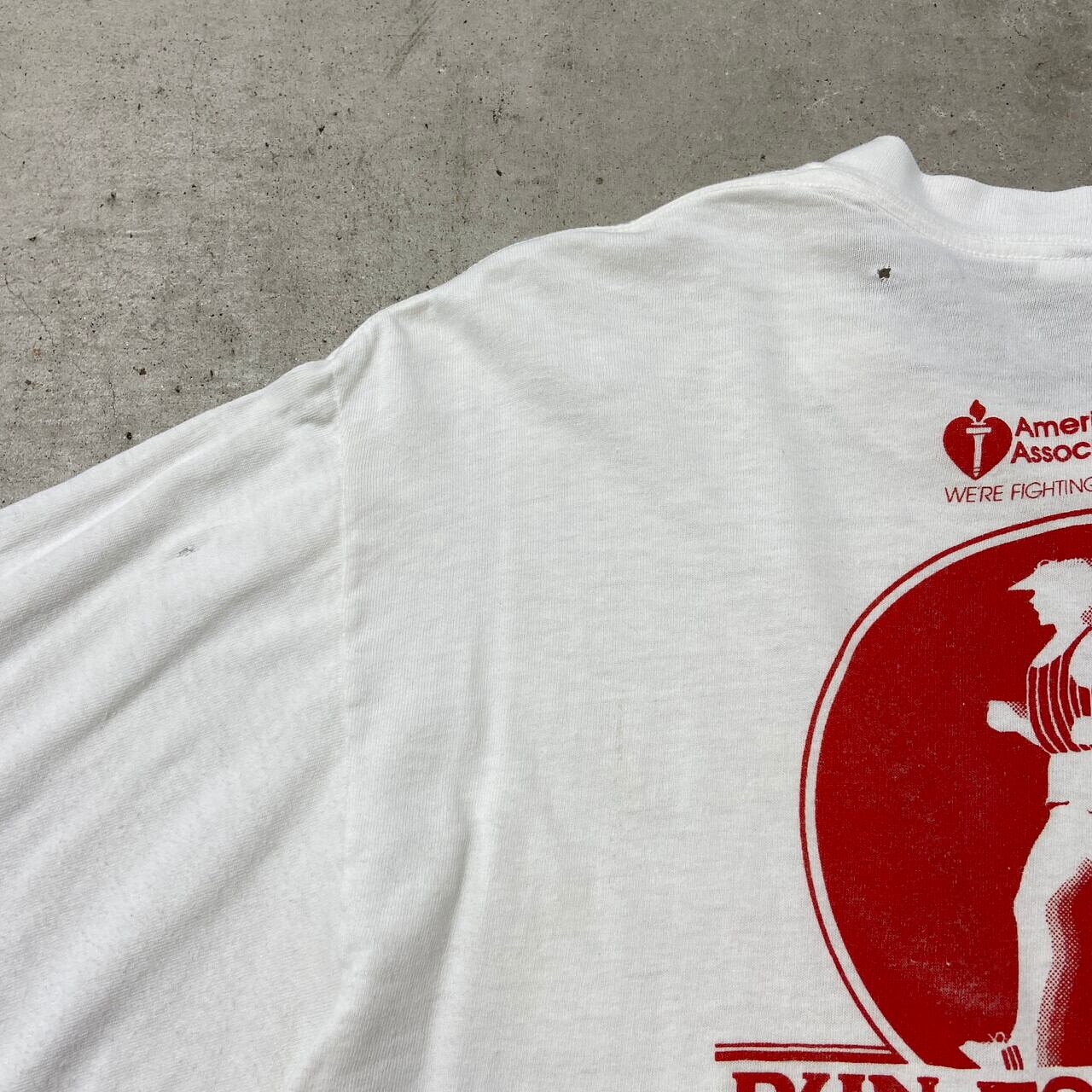■80年代 USA製 RUN FOR HEART プリント ロングTシャツ メンズM相当 古着 80s 1986 ヴィンテージ VINTAGE バックプリント 胸ロゴ イベント 企業ロゴ ロンT シングルステッチ 白【ロングTシャツ】/ホワイト