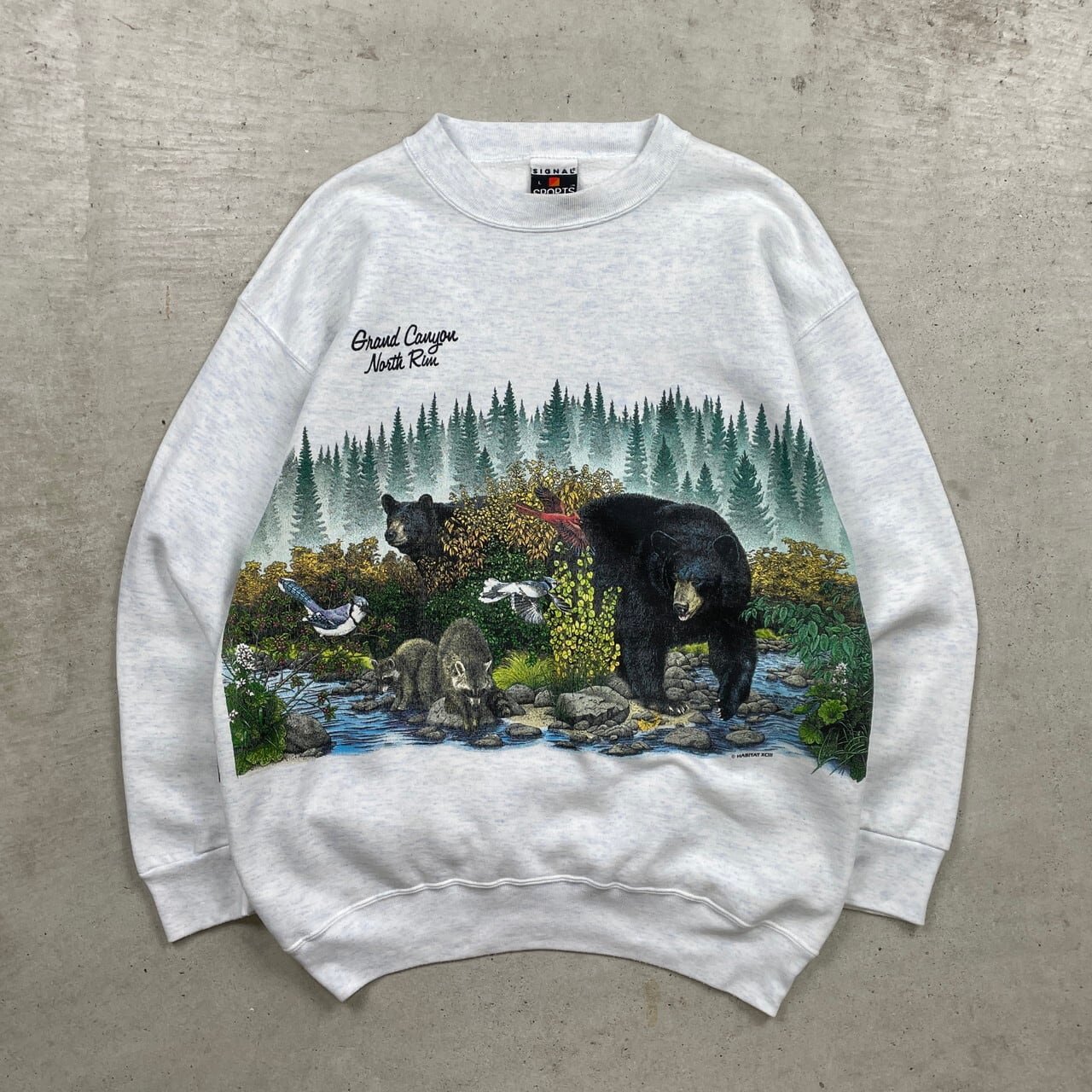 90年代 USA製 SIGNAL SPORTS アニマルプリント スウェットシャツ メンズL 古着 90s 両面プリント 裏起毛 クマ アライグマ VINTAGE ヴィンテージ グランドキャニオン 【スウェット】/ホワイト【WS2501-50】