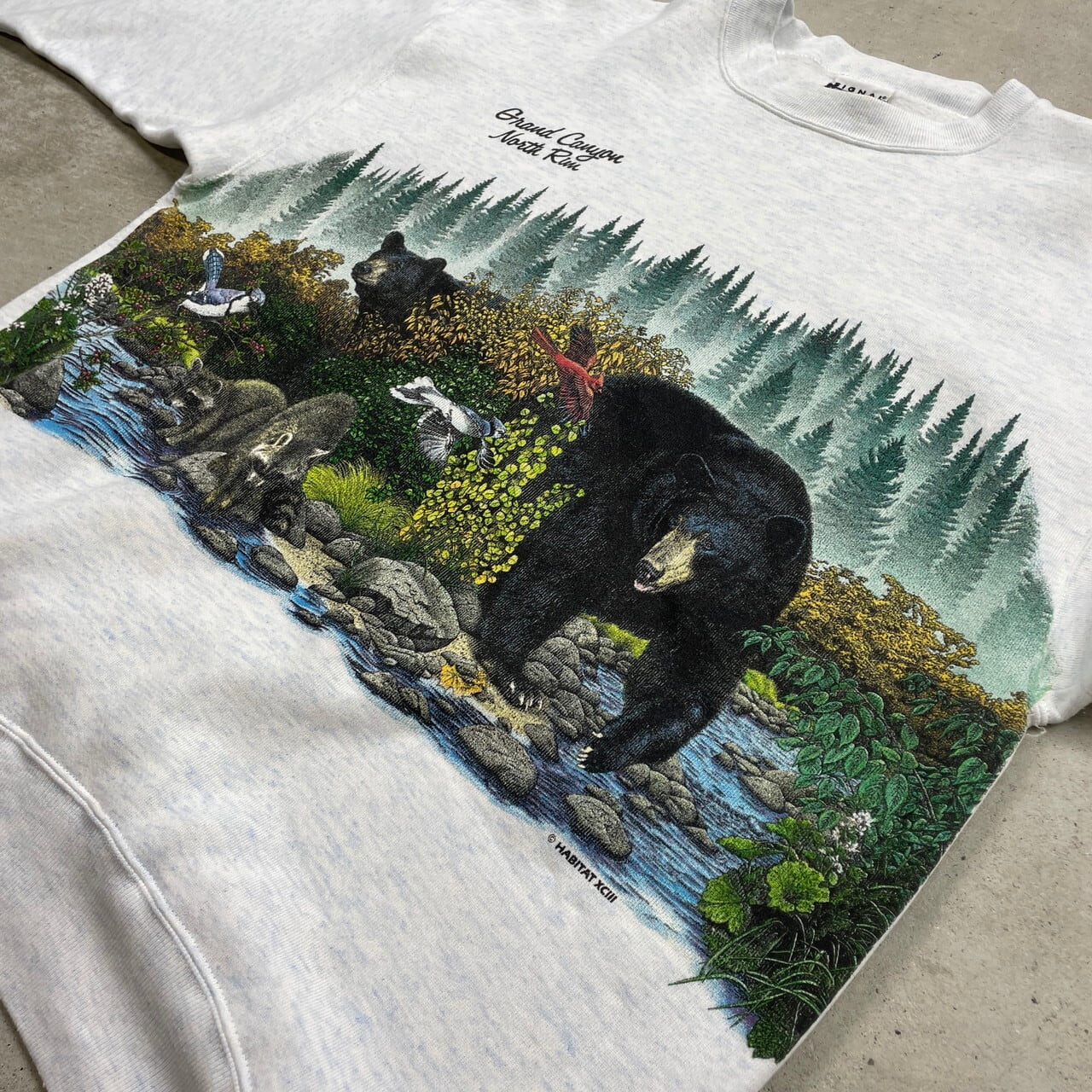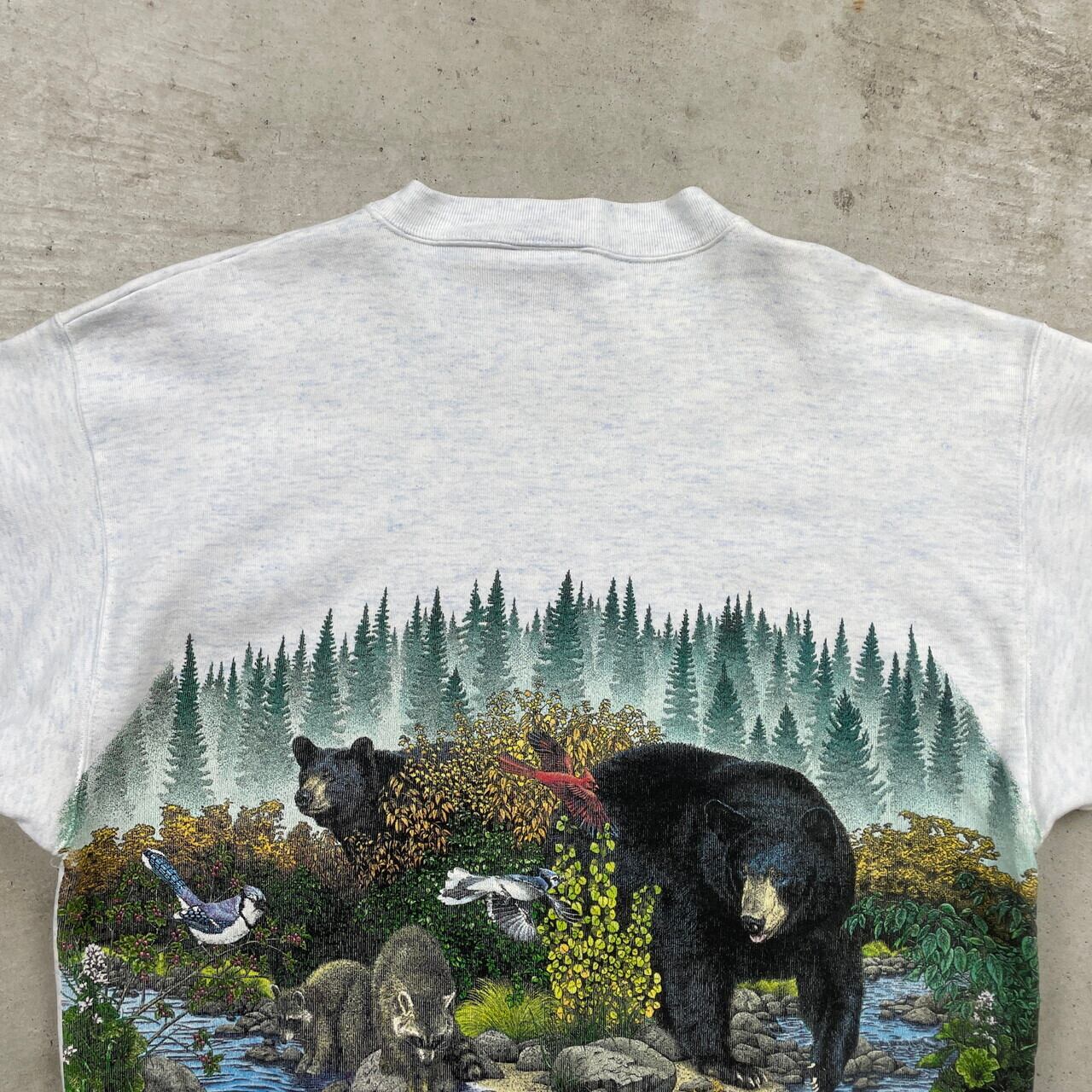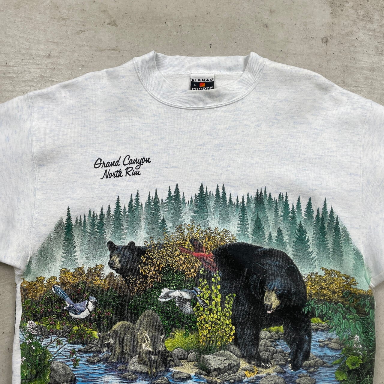 ■90年代 USA製 SIGNAL SPORTS アニマルプリント スウェットシャツ メンズL 古着 90s 両面プリント 裏起毛 クマ アライグマ VINTAGE ヴィンテージ グランドキャニオン 【スウェット】/ホワイト