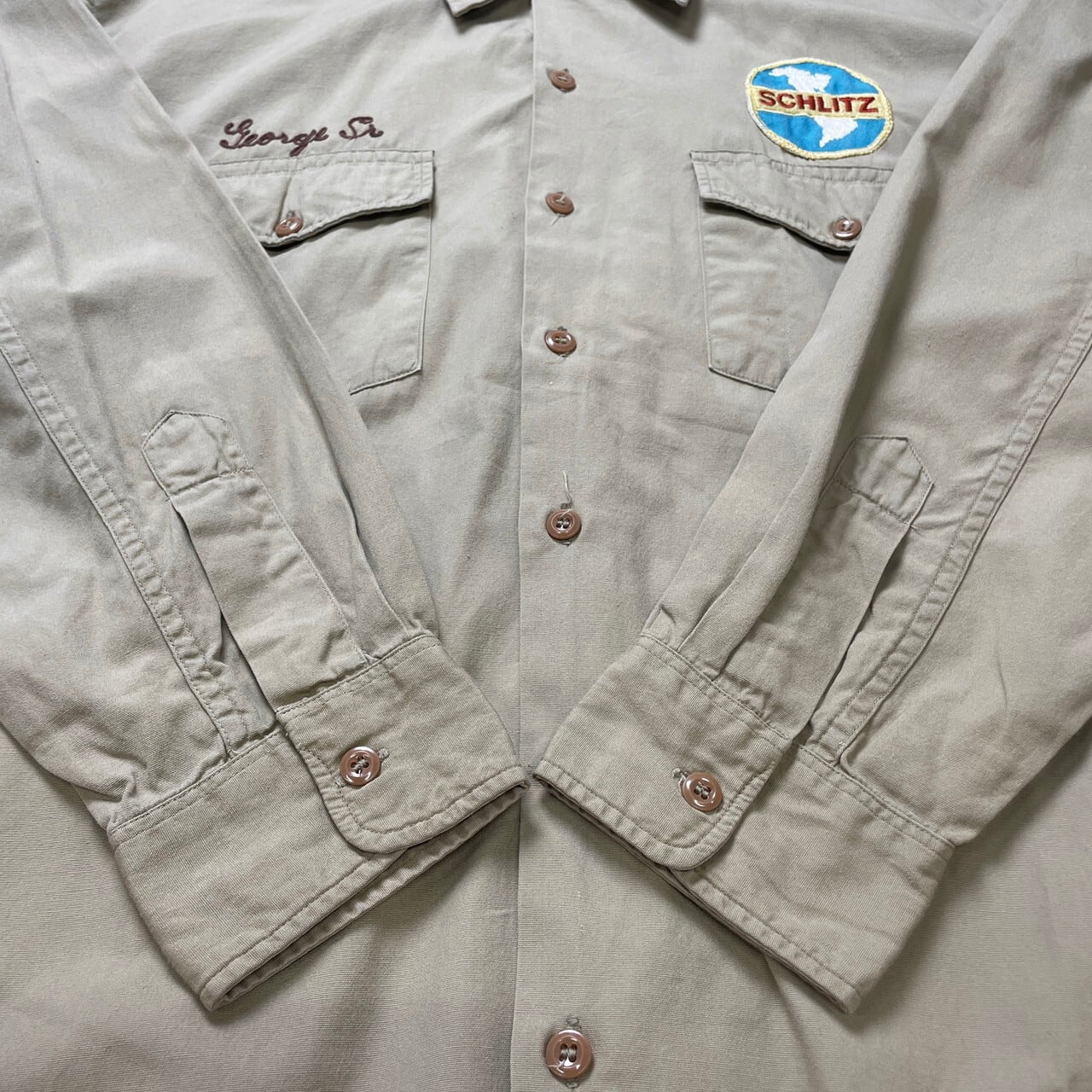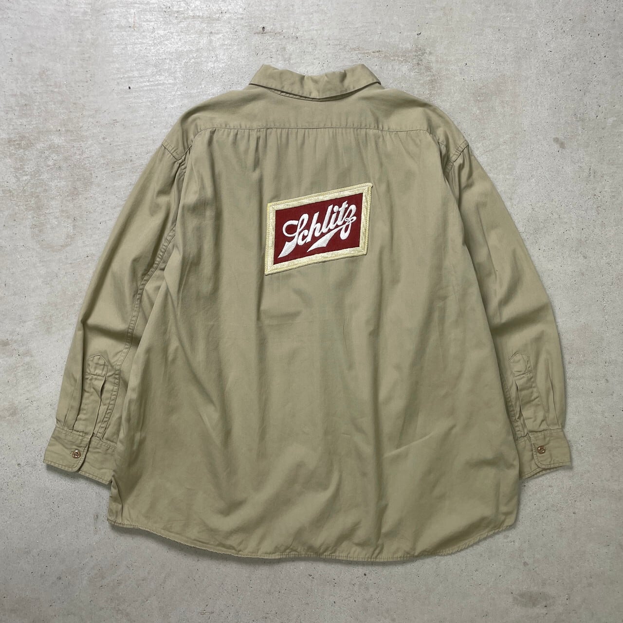 50年代 HARCO-DELUXE シュリッツ ビール Schlitz 長袖 ワークシャツ 企業ワッペン 開襟 メンズL 刺繍ワッペン チェーンステッチ 古着 ベージュ 50s ヴィンテージ VINTAGE カーキ【長袖シャツ】/ベージュ【SS26-30】