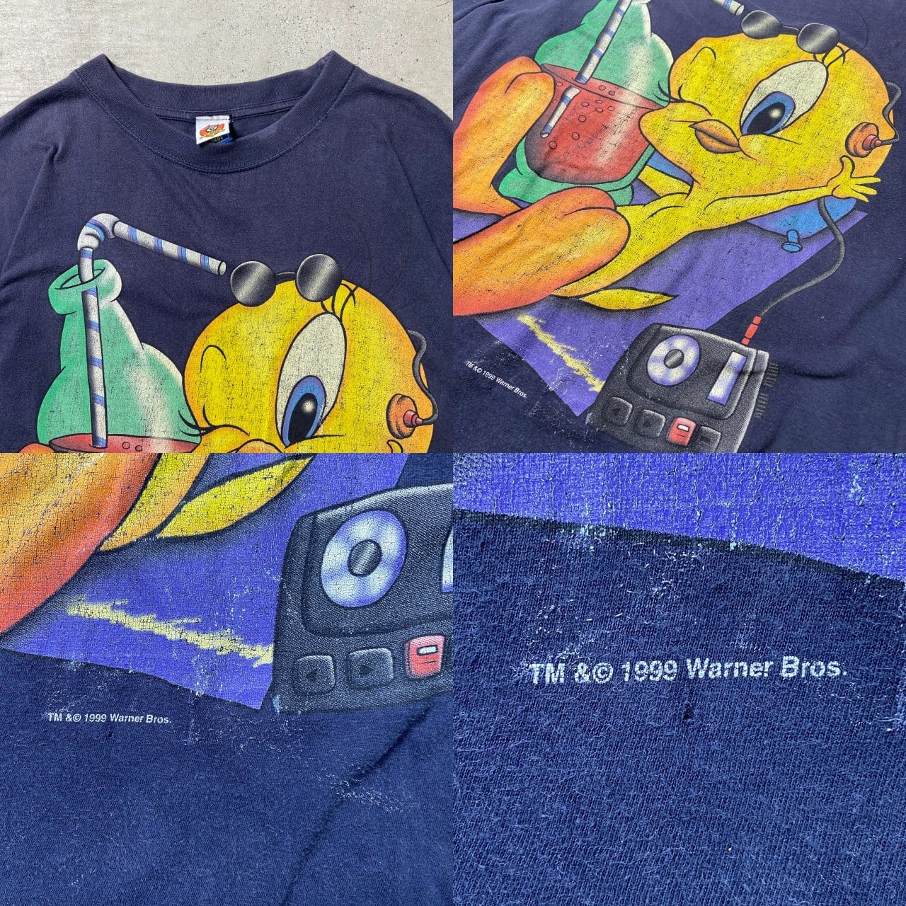 ■90年代 LOONEY TUNES ルーニー・テューンズ トゥイーティー キャラクター Tシャツ メンズL相当 古着 90s Tweety Bird VINTAGE ヴィンテージ 紺色 フェードネイビー【ロングTシャツ】/ネイビー