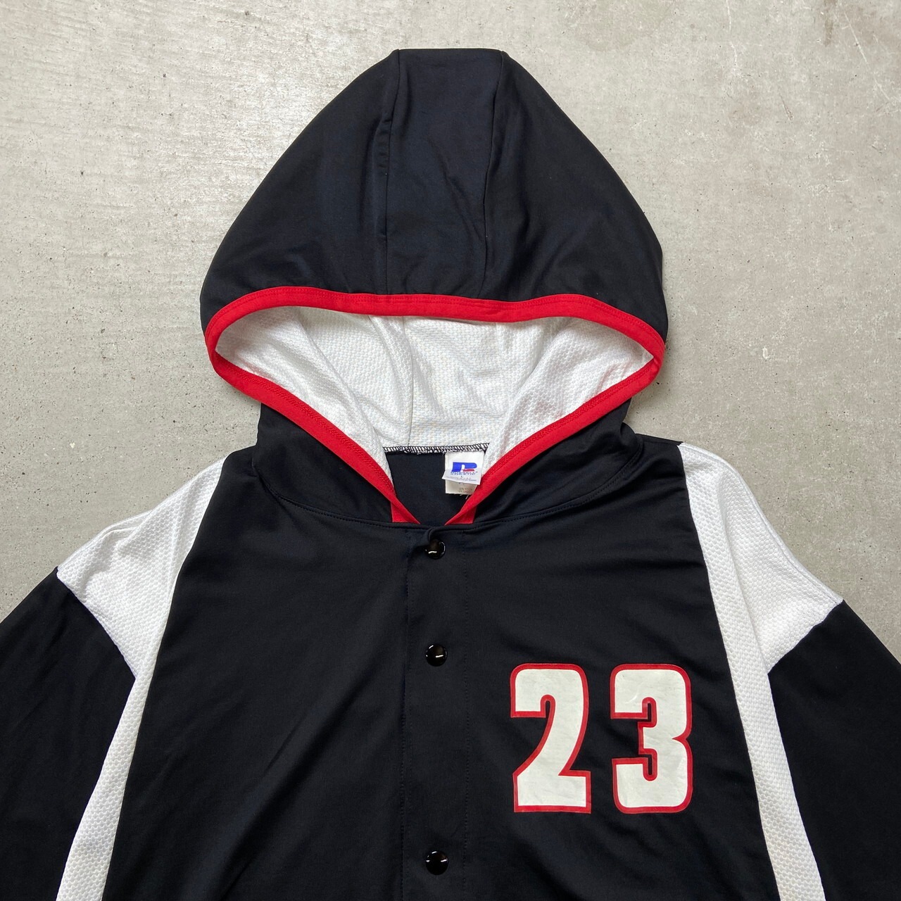 80~90年代 USA製 RUSSELL ATHLETIC ラッセル 半袖 ジャージパーカー トラックジャケット メンズL 古着 80s 90s VINTAGE ヴィンテージ ナンバリング スナップ 袖ロゴ刺繍 黒色【パーカー】/ブラック【BS25-50】
