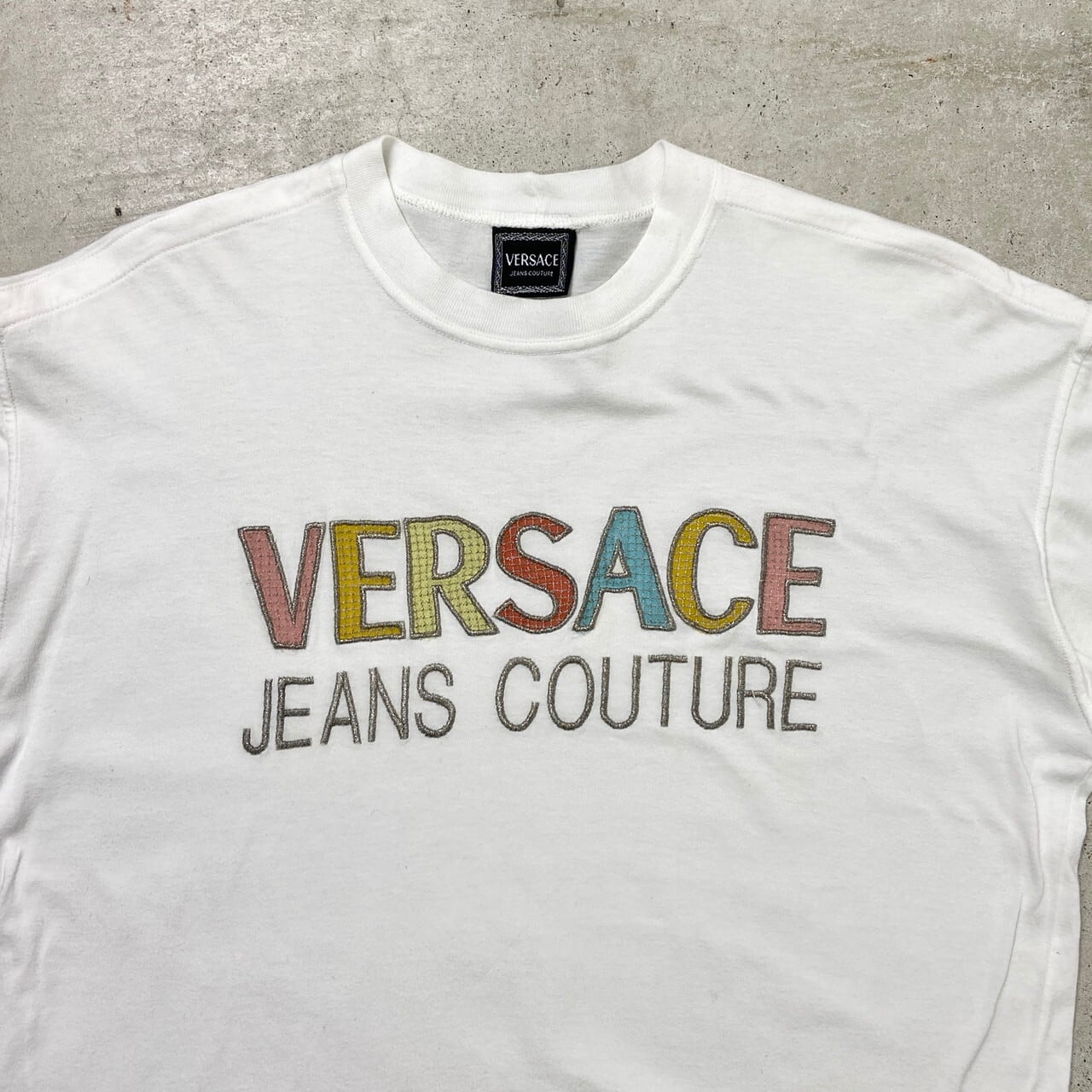 90年代 イタリア製 VERSACE JEANS COUTURE ヴェルサーチ ロゴ刺繍 Tシャツ メンズM 古着 90s ヴィンテージ VINTAGE 白 【Tシャツ】/ホワイト