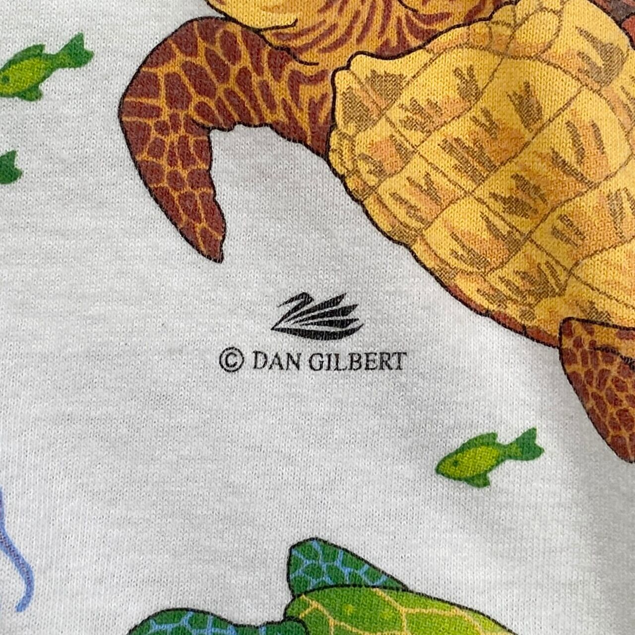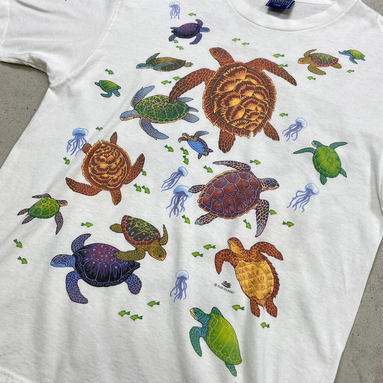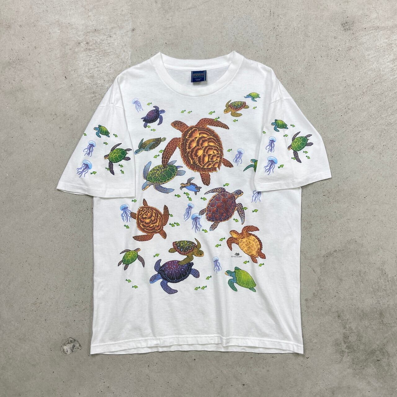 90年代 USA製 HARBORSIDE GRAPHICS アニマル カメ 亀 アートプリントTシャツ マルチプリント メンズL 古着 90s シングルステッチ ART ヴィンテージ VINTAGE 白色【Tシャツ】/ホワイト【SA2501-50】