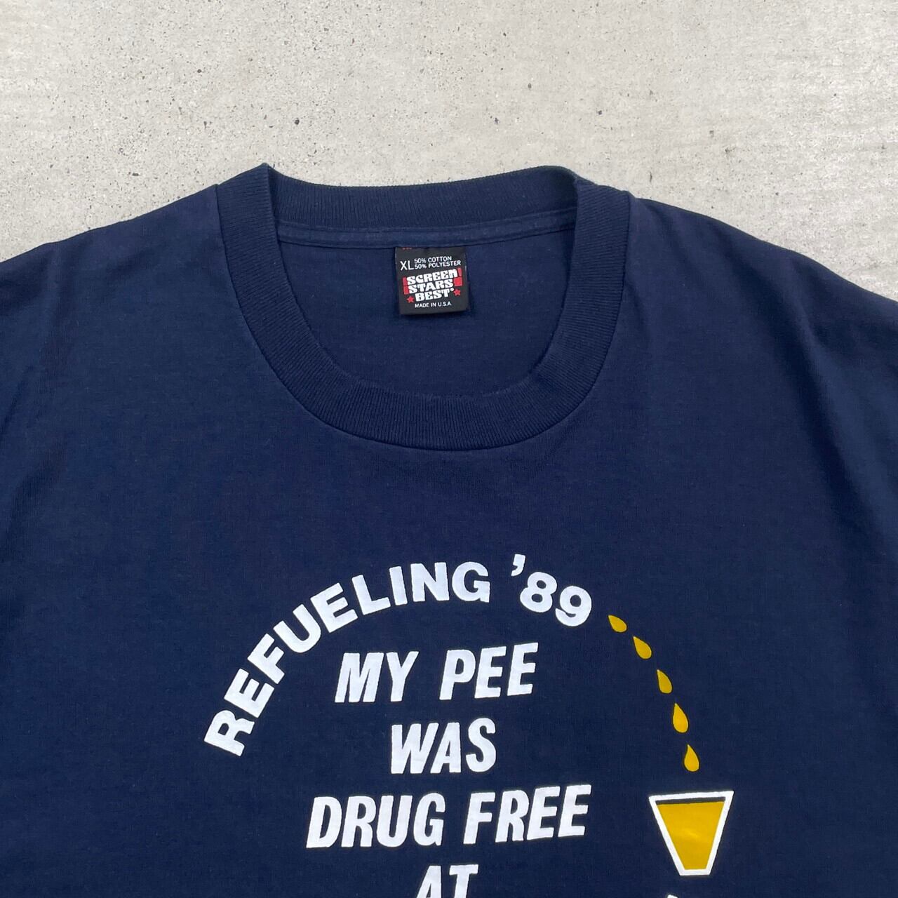 80年代 USA製 KNPP REFUELING'89 ジョーク メッセージ 企業 プリントTシャツ メンズXL 古着 80s シングルステッチ ヴィンテージ VINTAGE 紺色【Tシャツ】/ネイビー【SA2501-50】