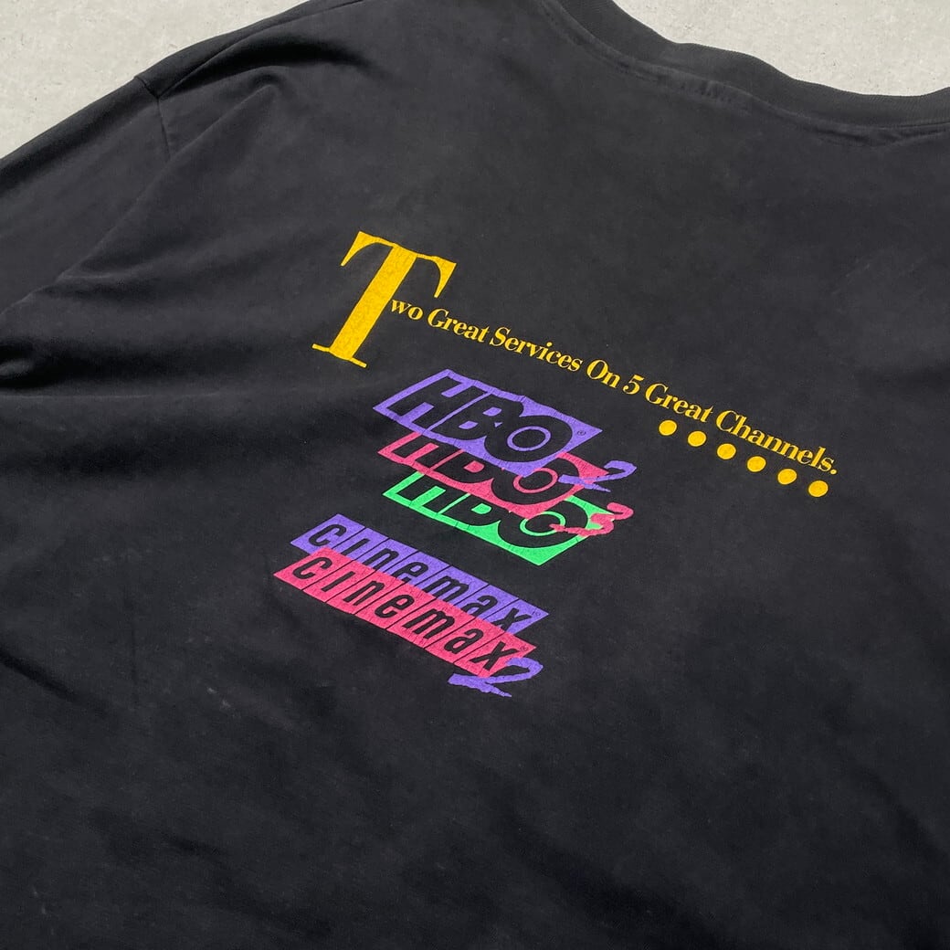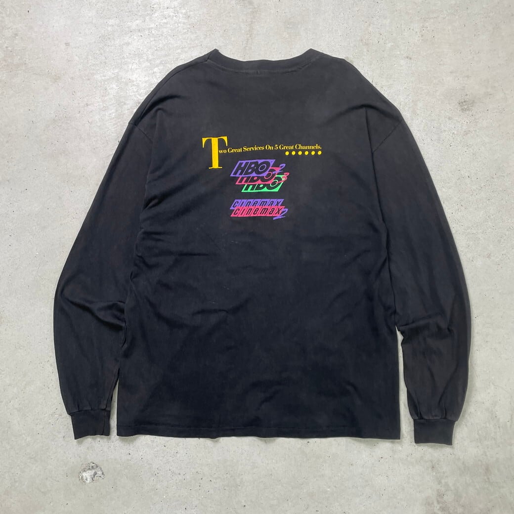 ■90年代 USA製 HBO CINEMAX ロングTシャツ ロンT 企業ロゴプリント ケーブルテレビ局 メンズXL 古着 90s シングルステッチ ヴィンテージ VINTAGE メッセージ フェードブラック 墨黒【ロングTシャツ】/ブラック