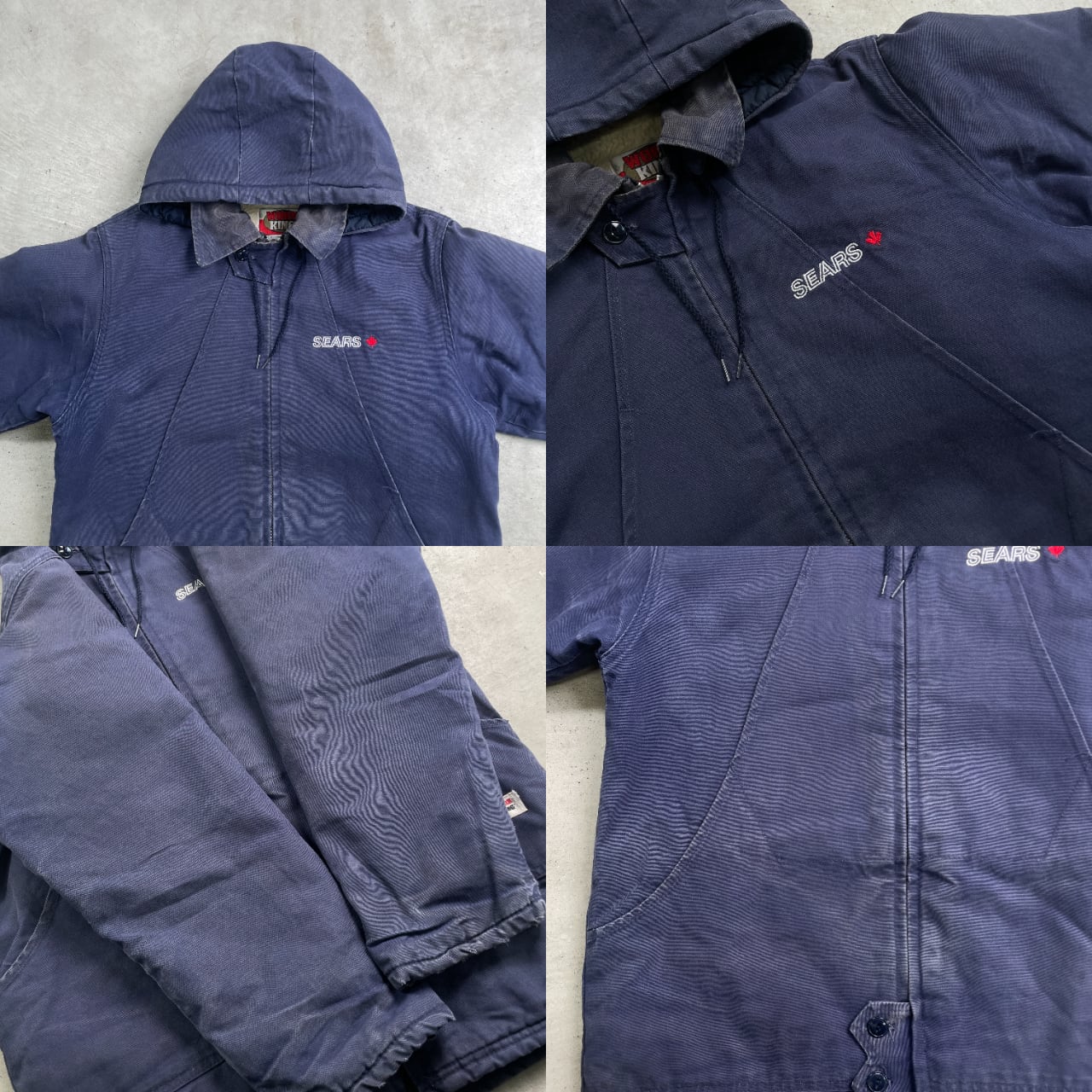 ■WORK KING ダック地 SEARS シアーズ 企業 ワンポイントロゴ刺繍 ワークジャケット メンズM 古着 フード着脱型 ボアライナー コットンジャケット 紺色 【ワークジャケット】/ネイビー