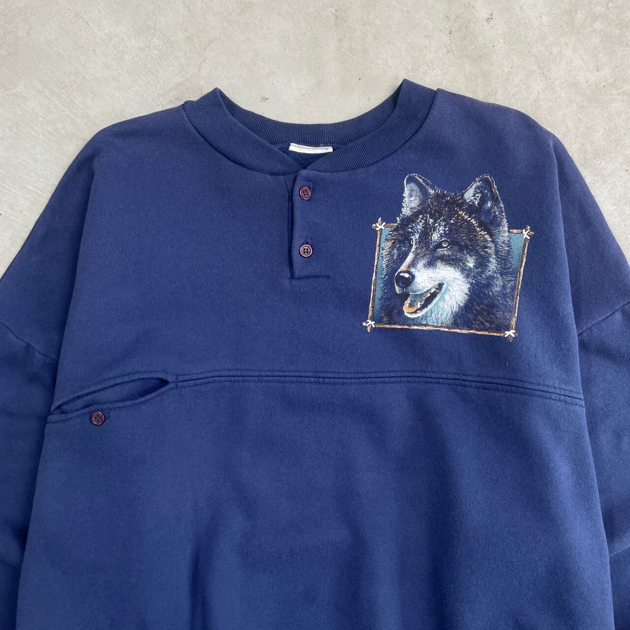90年代 オオカミ柄 アニマルプリントスウェット 胸ポケット ヘンリーネック メンズXL相当 古着 90s 裏起毛 VINTAGE ヴィンテージ 動物 狼トレーナー フェードネイビー 紺色【スウェット】/ネイビー【SS50-AW】