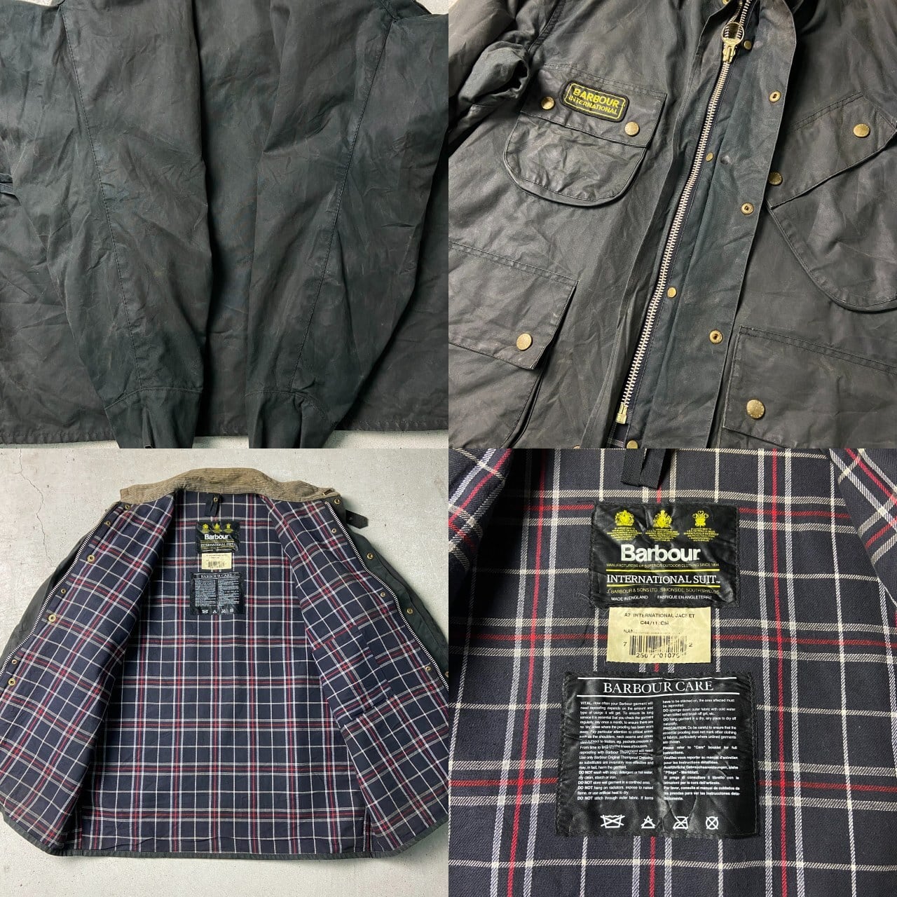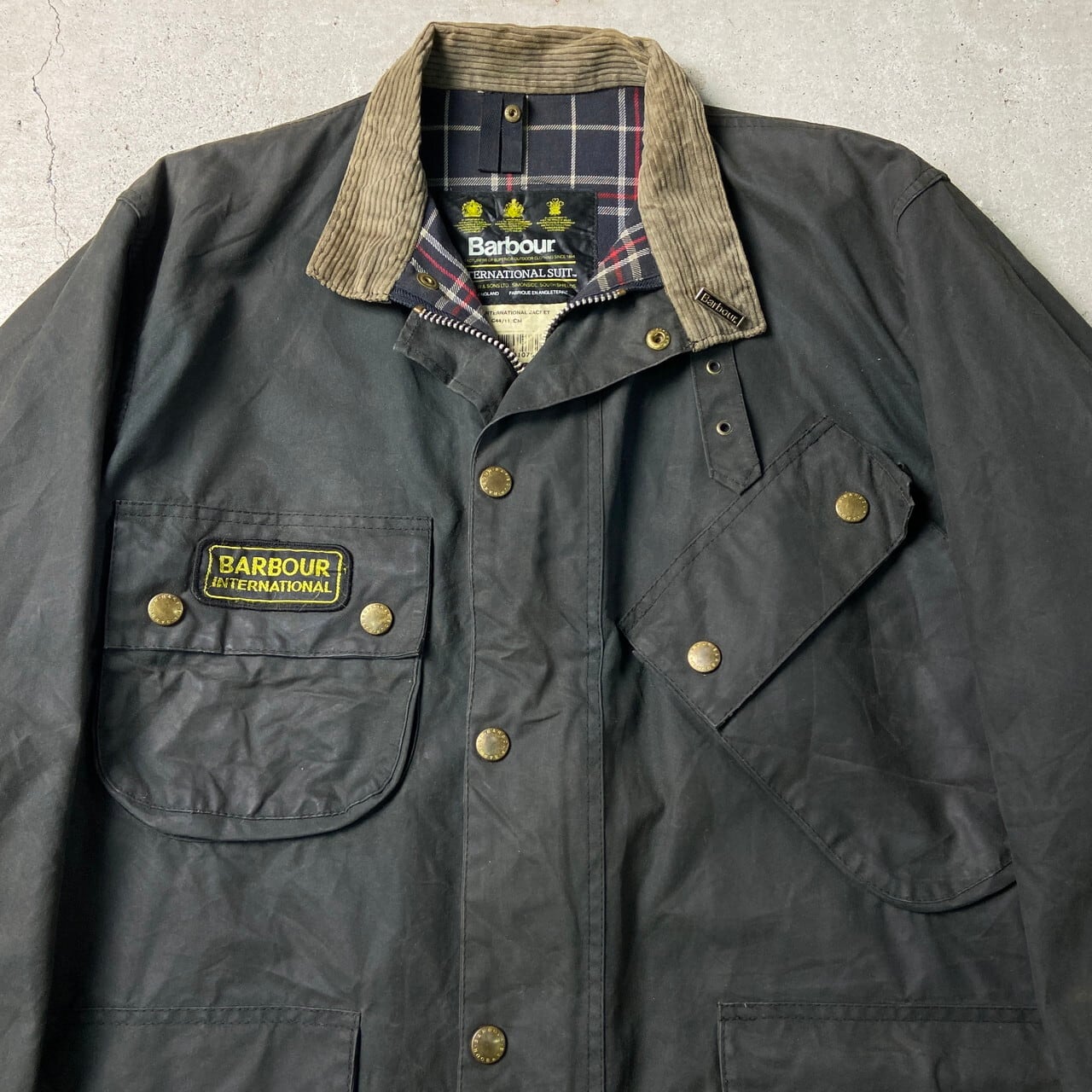 ■95年製 90年代 英国製 Barbour INTERNATIONAL SUIT バブアー インターナショナルスーツ オイルドジャケット C44 メンズL相当 古着 90s 旧3ワラント ピンバッジ付き バイク モーターサイクルジャケット ヴィンテージ VINTAGE ブラック 黒色【ワークジャケット】/ブラック
