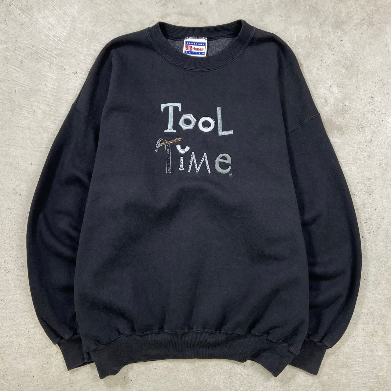 TOOL TIME メッセージ刺繍 スウェットシャツ メンズXL 古着 ヘビーウェイト 裏起毛 トレーナー フェードブラック 墨黒【スウェット】/ブラック【SS50-AW】