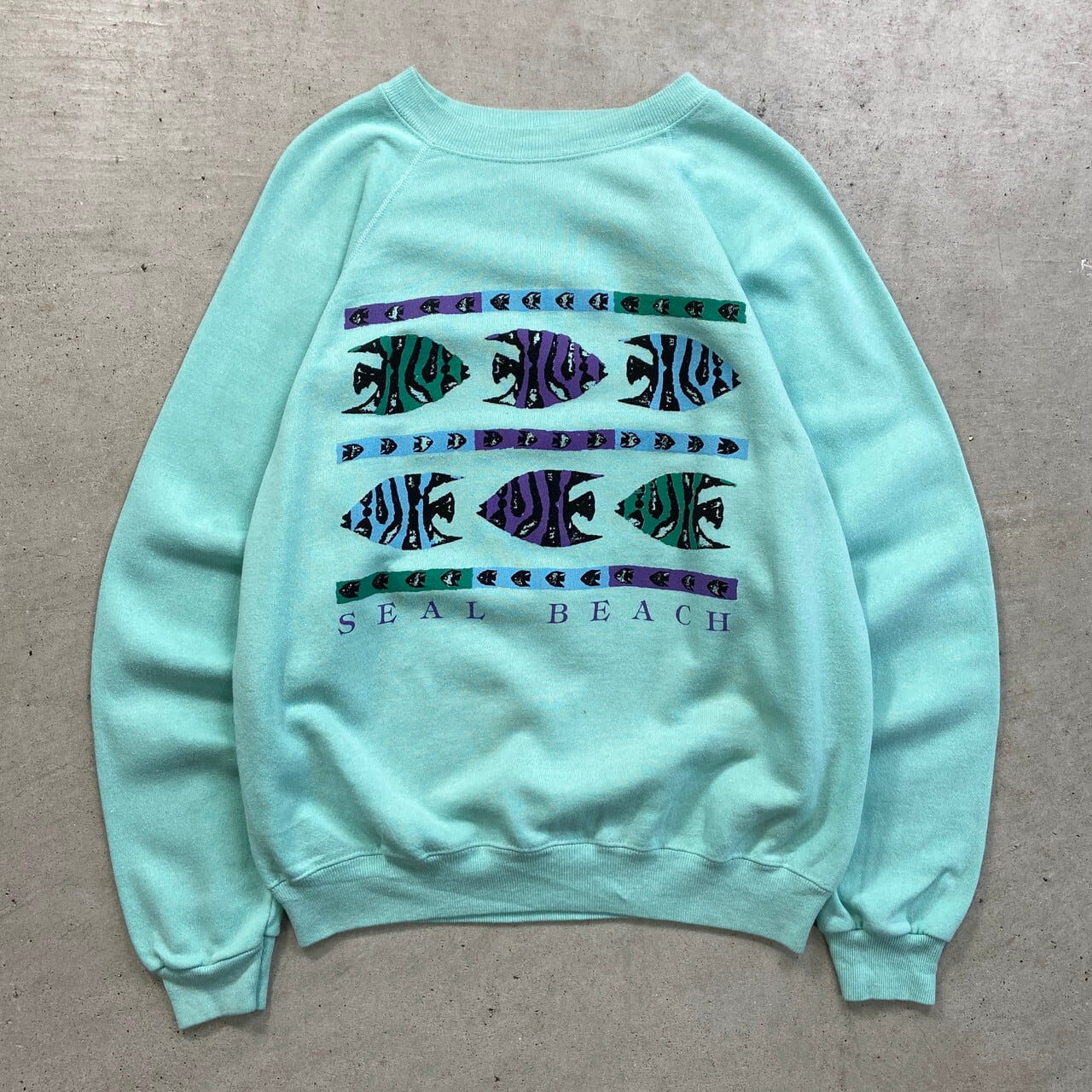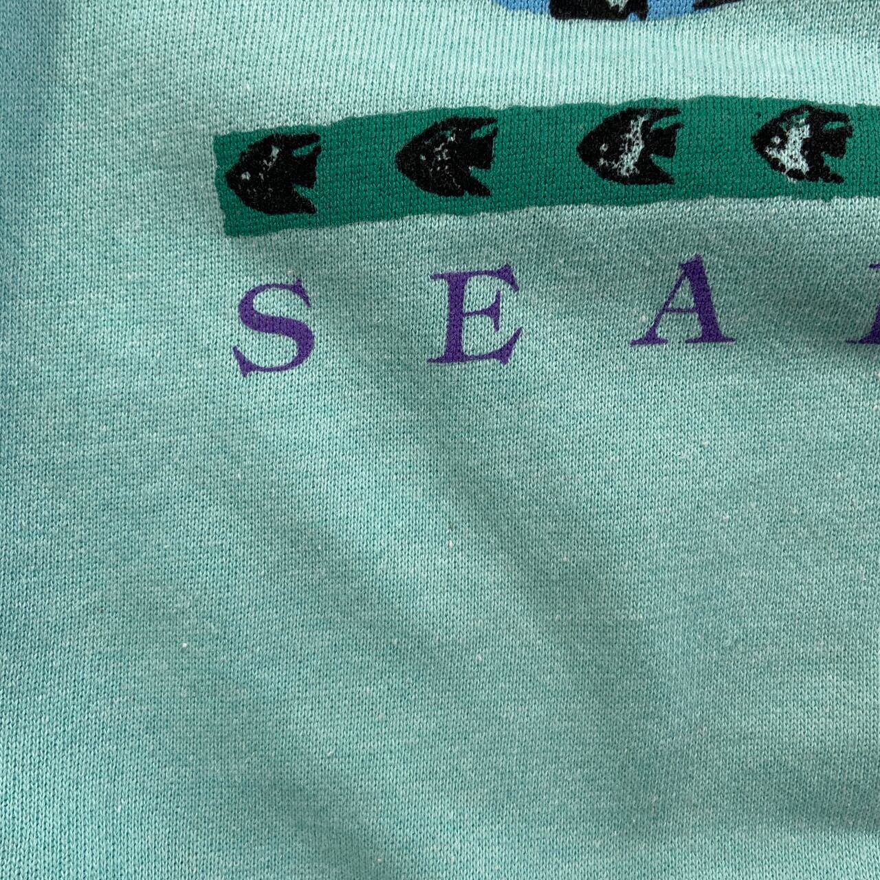 ■80年代 USA製 Hanes ヘインズ SEAL BEACH スーベニアプリント ラグラン スウェットシャツ メンズL レディース 古着 80s VINTAGE ヴィンテージ トレーナー シールビーチ カリフォルニア 魚 フィッシュ エメラルドグリーン 緑色【スウェット】/グリーン
