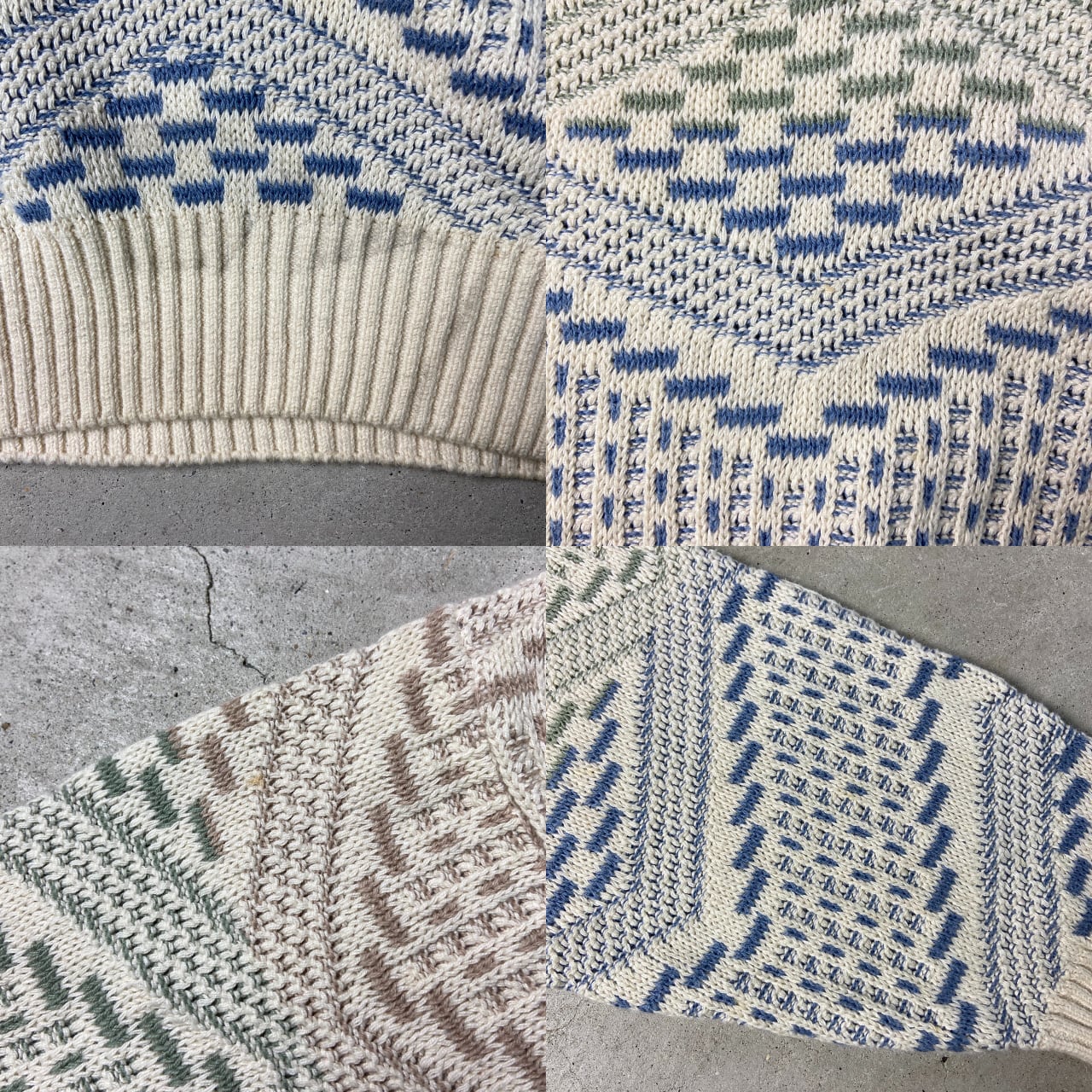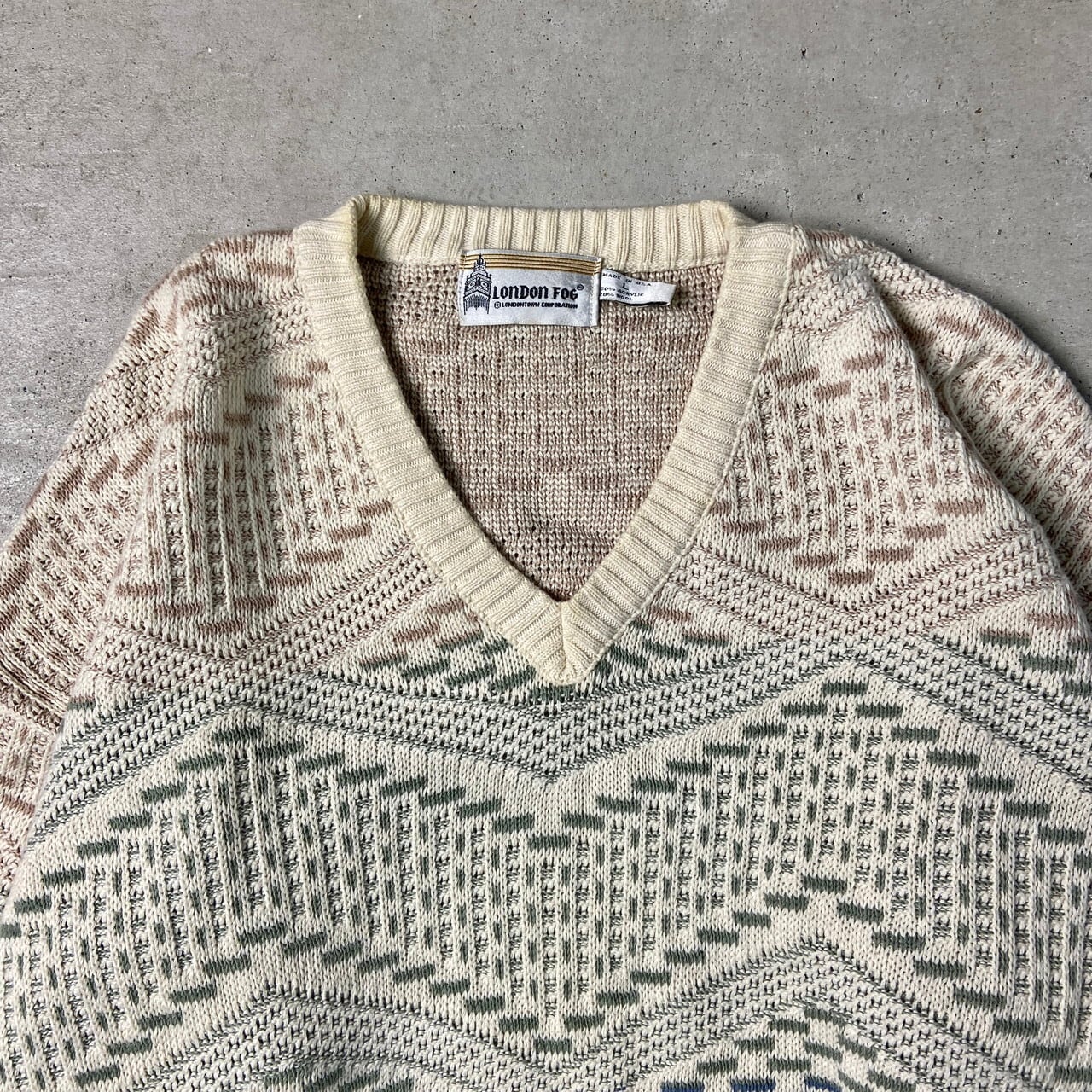 90年代 USA製 LONDON FOG ロンドンフォグ アクリルニットセーター 総柄 メンズL 古着 Vネック ウール混合 90s ヴィンテージ ビンテージ ベージュ ブラウン 茶色 グリーン 緑 ネイビー 紺【ニットセーター】/ベージュSS30