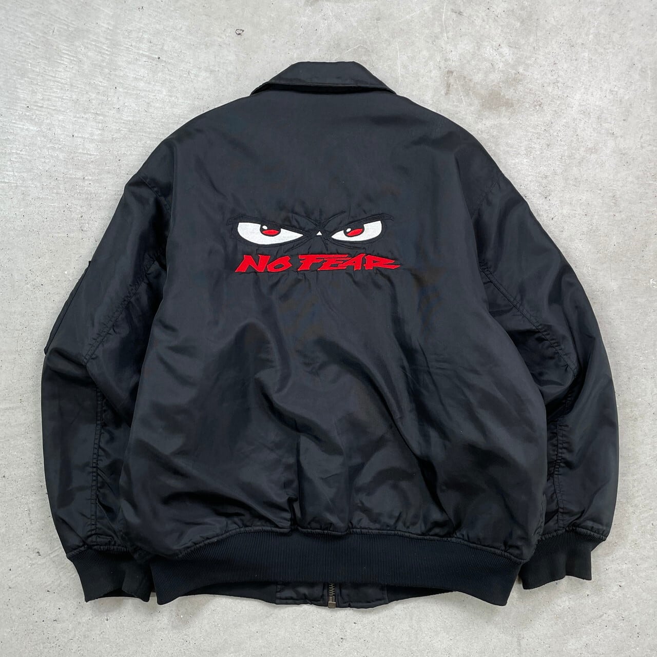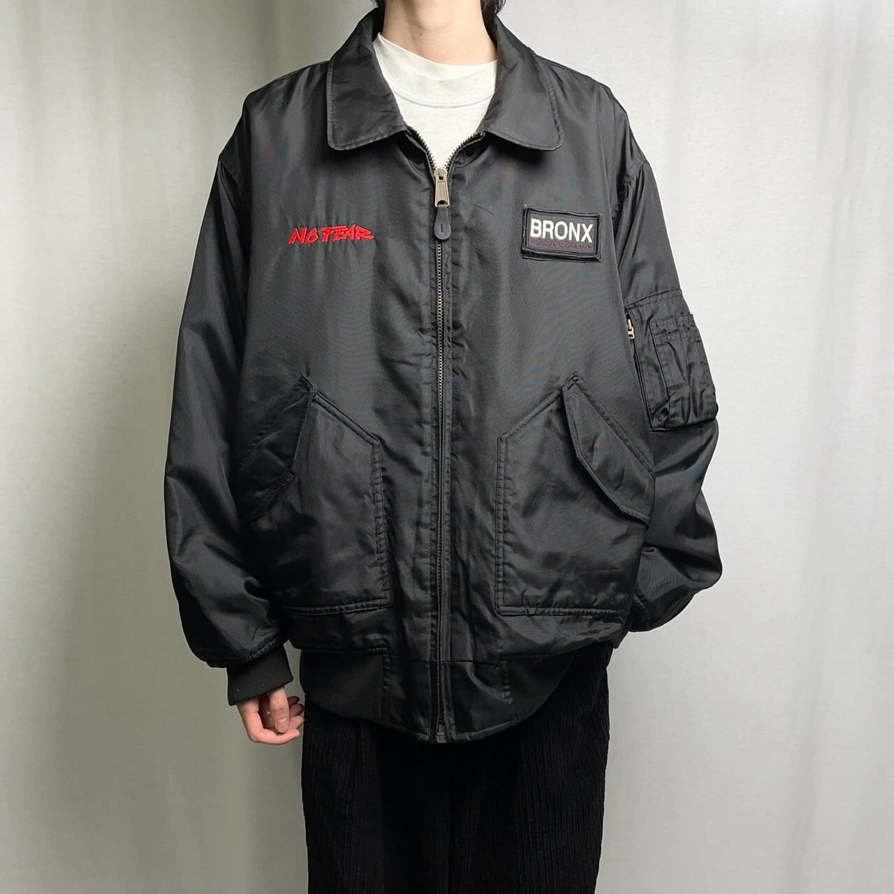BOOTLEG NO FEAR CWUタイプ ミリタリー フライトジャケット ロゴ刺繍 メンズ2XL 古着 ブートレグ ノーフィア サーフ スケート ストリート ボンバージャケット キルティングライナー シガレットホルダー付き 黒色 ビッグサイズ 大きいサイズ【ミリタリージャケット】/ブラック【SS30-AW】
