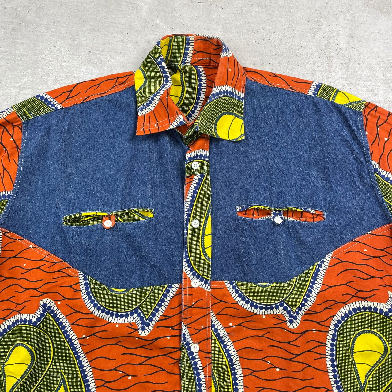■UNKNOWN アフリカンバティック 切り替え デニムシャツ メンズXL相当 古着 ヴィンテージ VINTAGE 【長袖シャツ】/マルチカラー